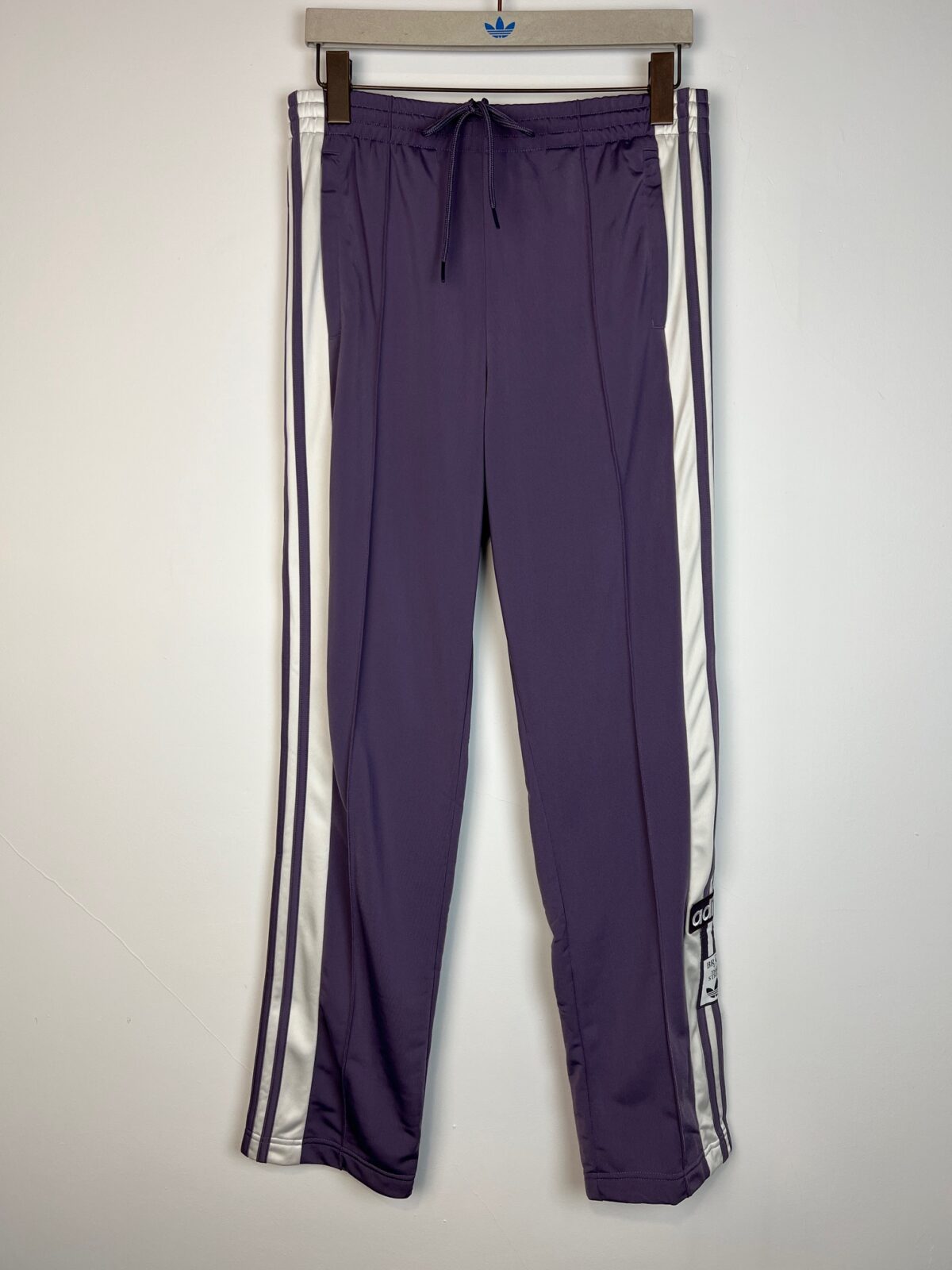 Spodnie Adidas Adibreak wrzosowe, nogawki rozpinane, na lewej nogawce charakterystyczne logo, model sample.