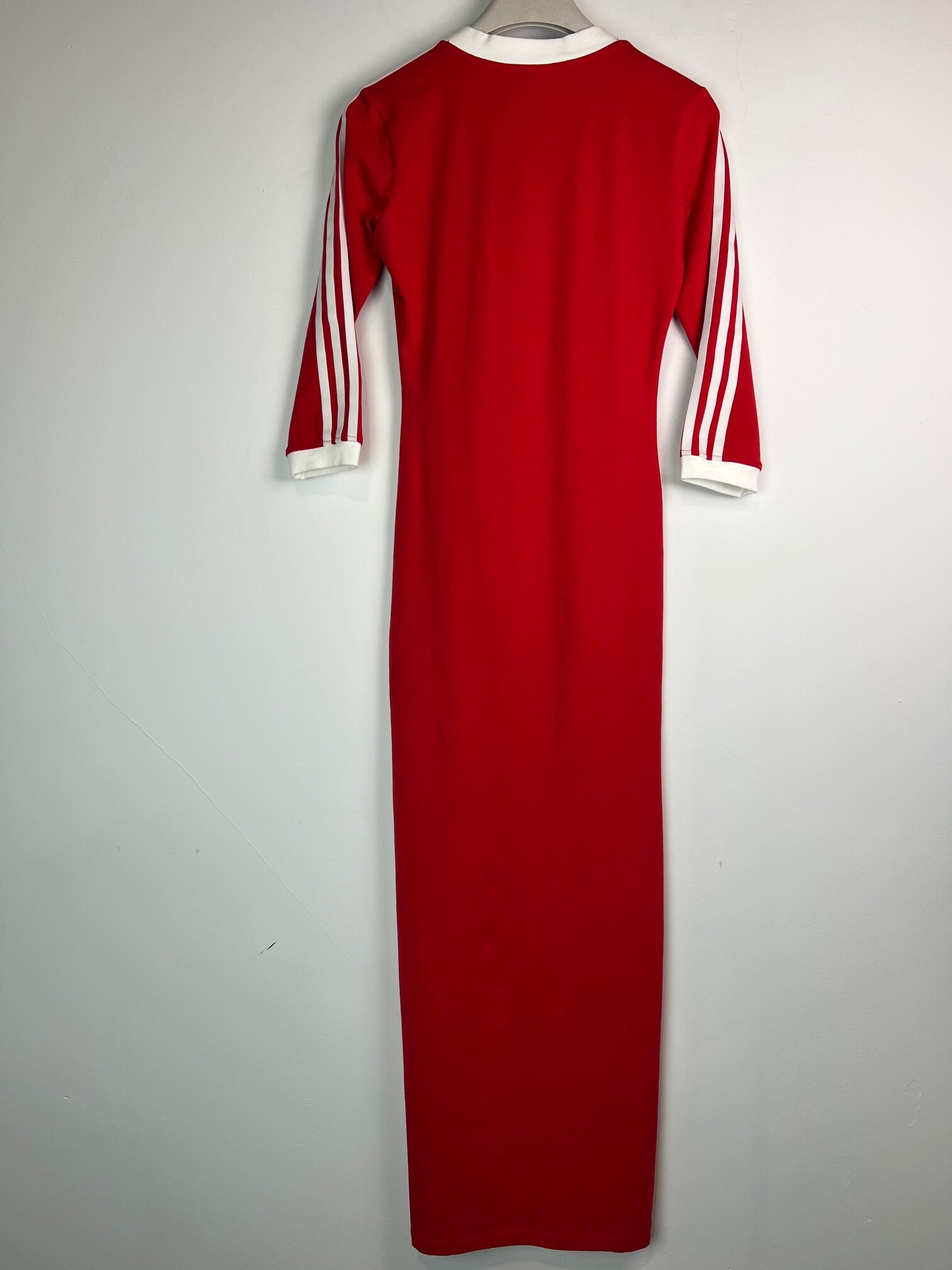 Długa sukienka Adidas, czerwona, z boku na dole rozcięcie 56 cm ,w składzie przewaga bawełny, szerokość w talii 32 cm, rozmiar z metki 30-32.