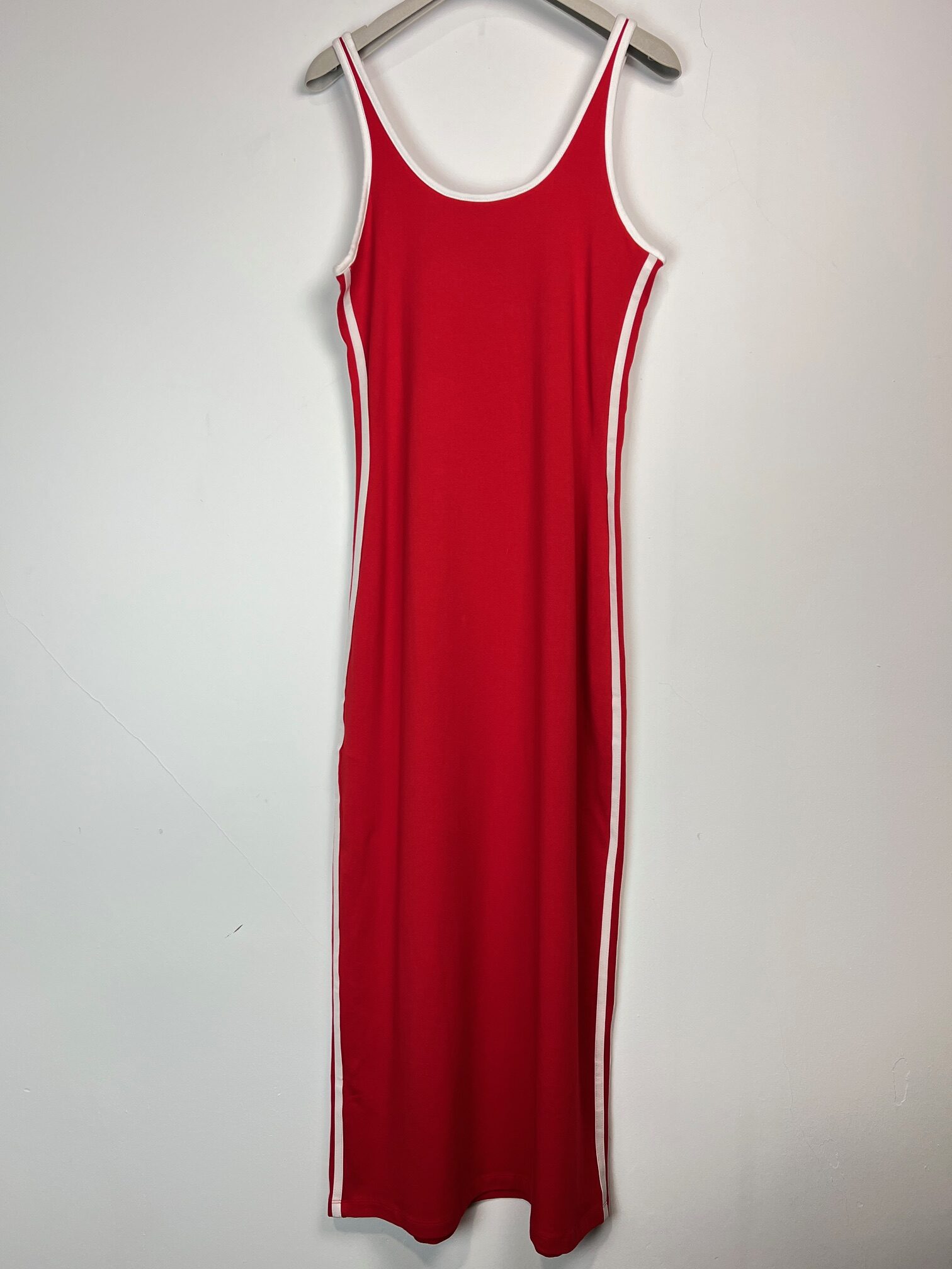 Sukienka na ramiączkach Adidas Originals, czerwona z rozcięciem ma dole, rozmiar z metki 38-40, metka z kodem produktu wycięta.