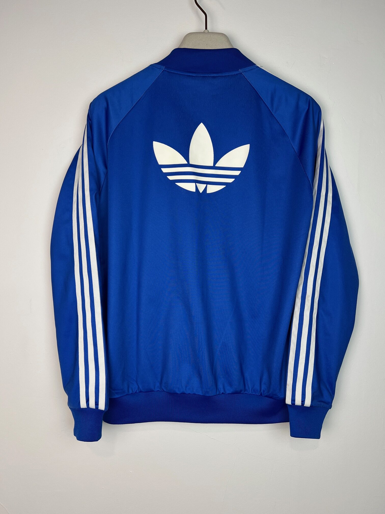 Bluza damska Adidas Originals x Farm Rio, z motywem tukanów, na plecach białe logo Trefoil, z przodu 2 zamykane kieszenie, kolor niebieski głęboki, rozmiar z metki 32.