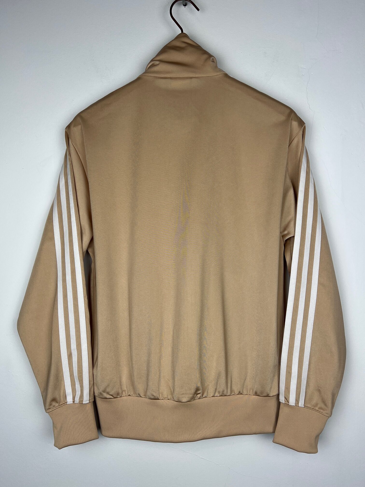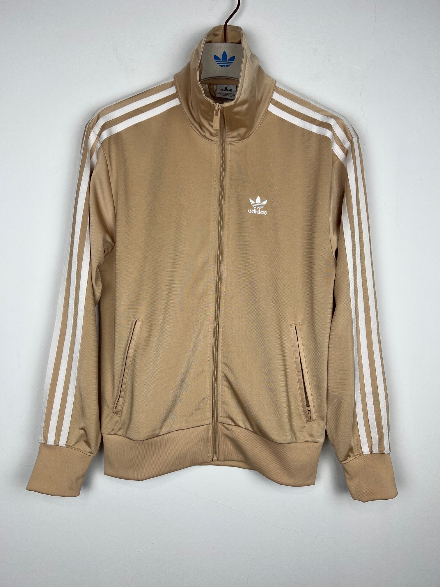 Bluza damska Adidas Originals Firebird TT oversize, beżowa z białymi paskami, zapinana na zamek, 2 kieszenie na zamek.