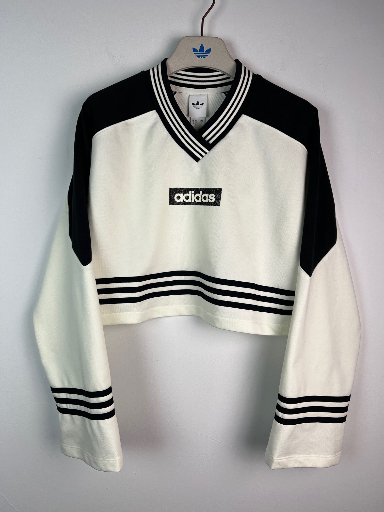 Krótka bluza damska top Adidas Originals, w kolorze kremowym, z długimi szerokimi rękawami, wkładana przez głowę, rozmiar z metki 30-32, metka z kodem produktu wycięta.