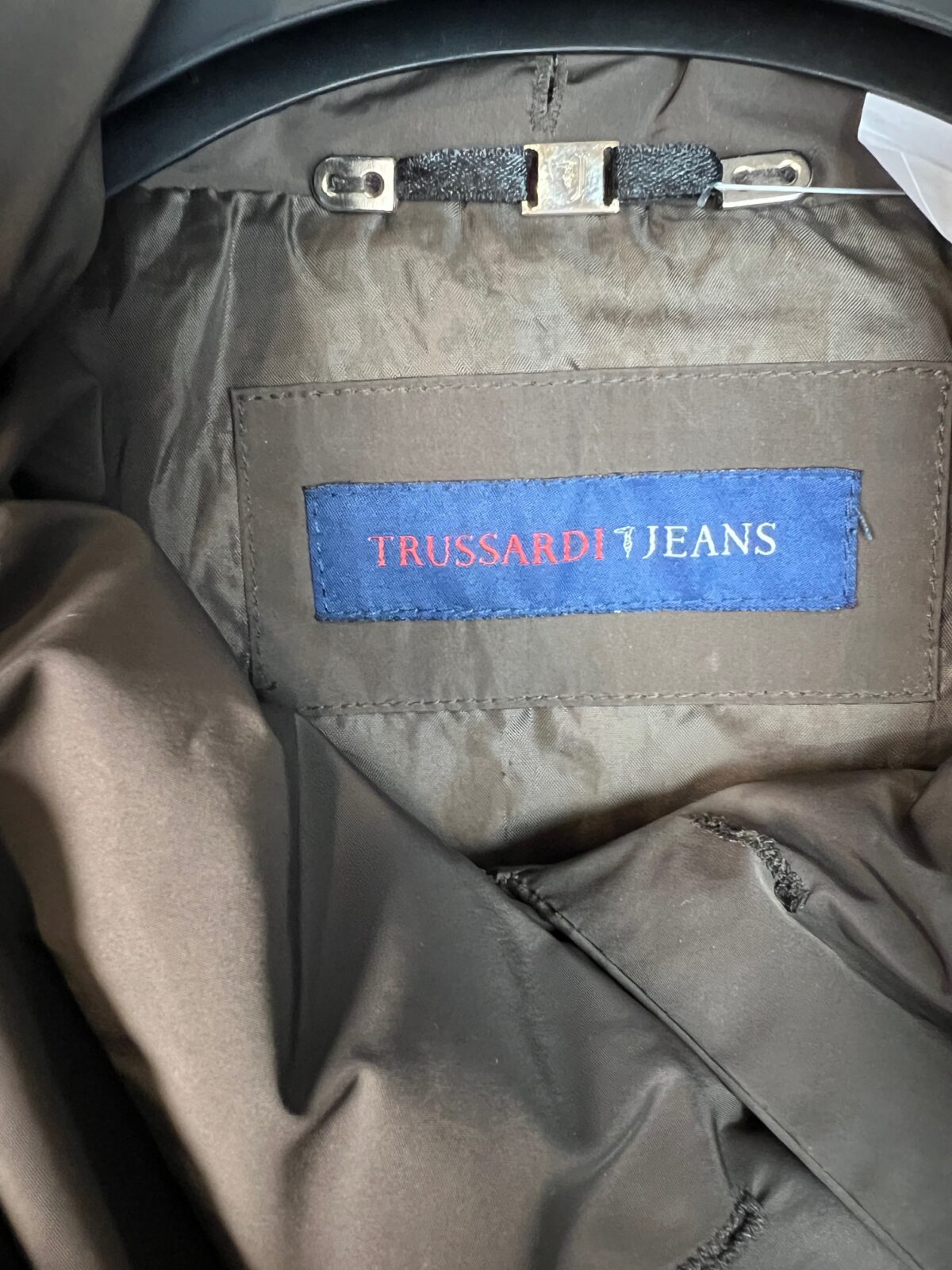 Damska kurtka Trussardi Jeans, czekoladowa, naturalna puchowa, zapinana na guziki, taliowana, z przodu 2 kieszenie za zamek, z wysokim kołnierzem-kominem, w pasie przewiązana paskiem, dwurzędowa, guziki z pięknym logo Trussardi, szerokość w biodrach 50 cm.