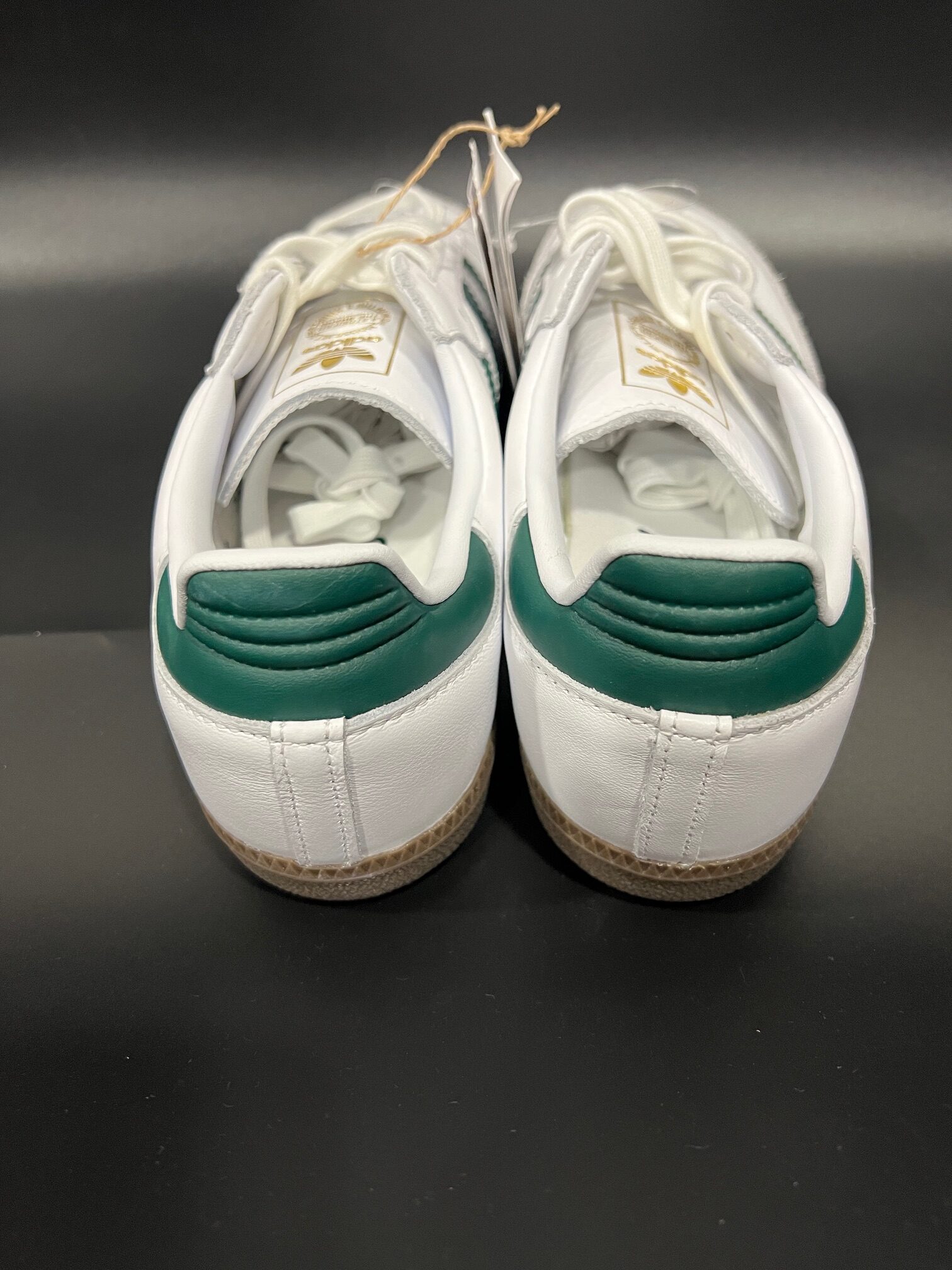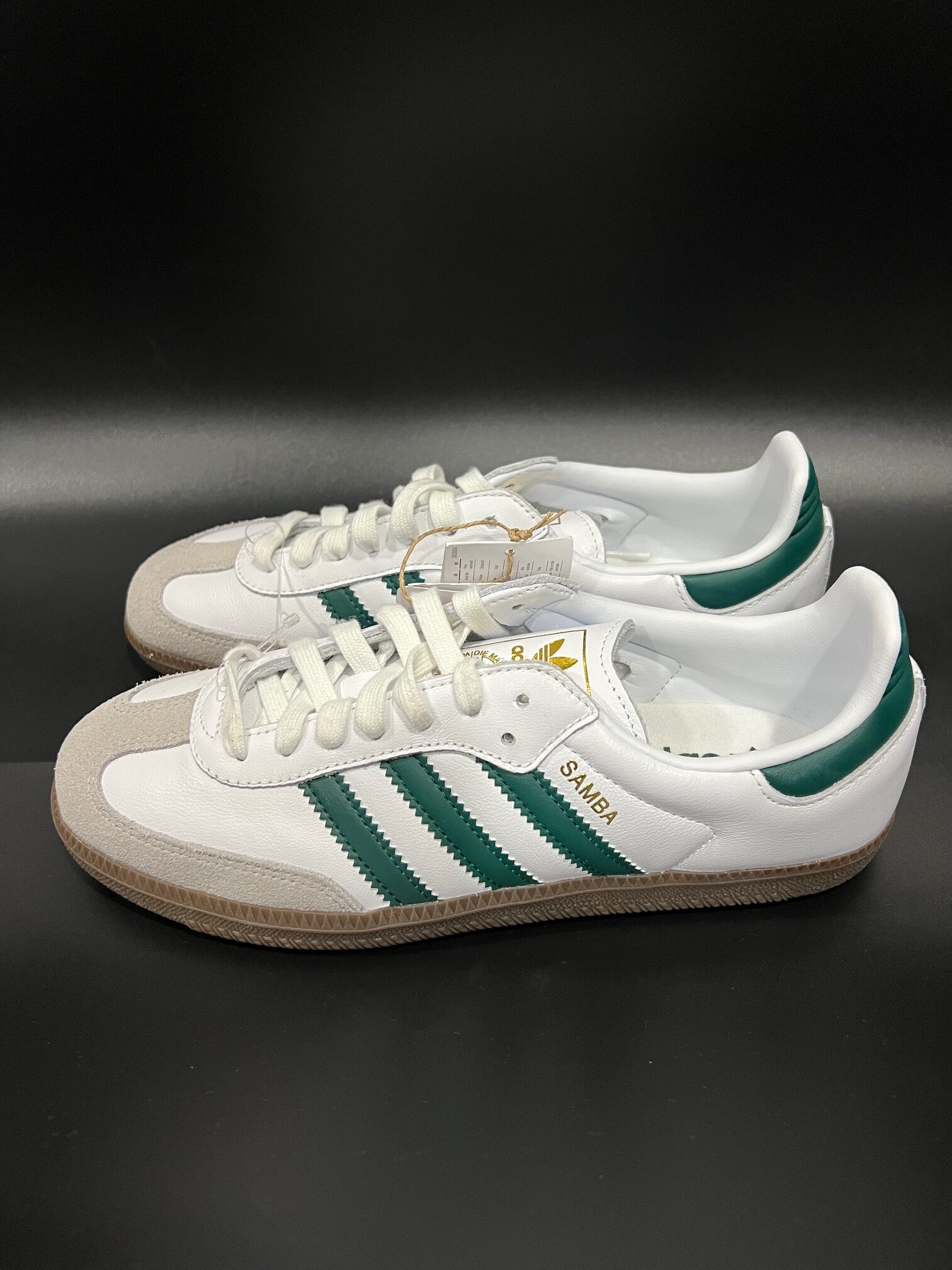 Sneakersy Adidas Samba OG, z ciemnozielonymi paskami oraz złotym logo na językach, z metką, bez oryginalnego pudełka, model unisex.