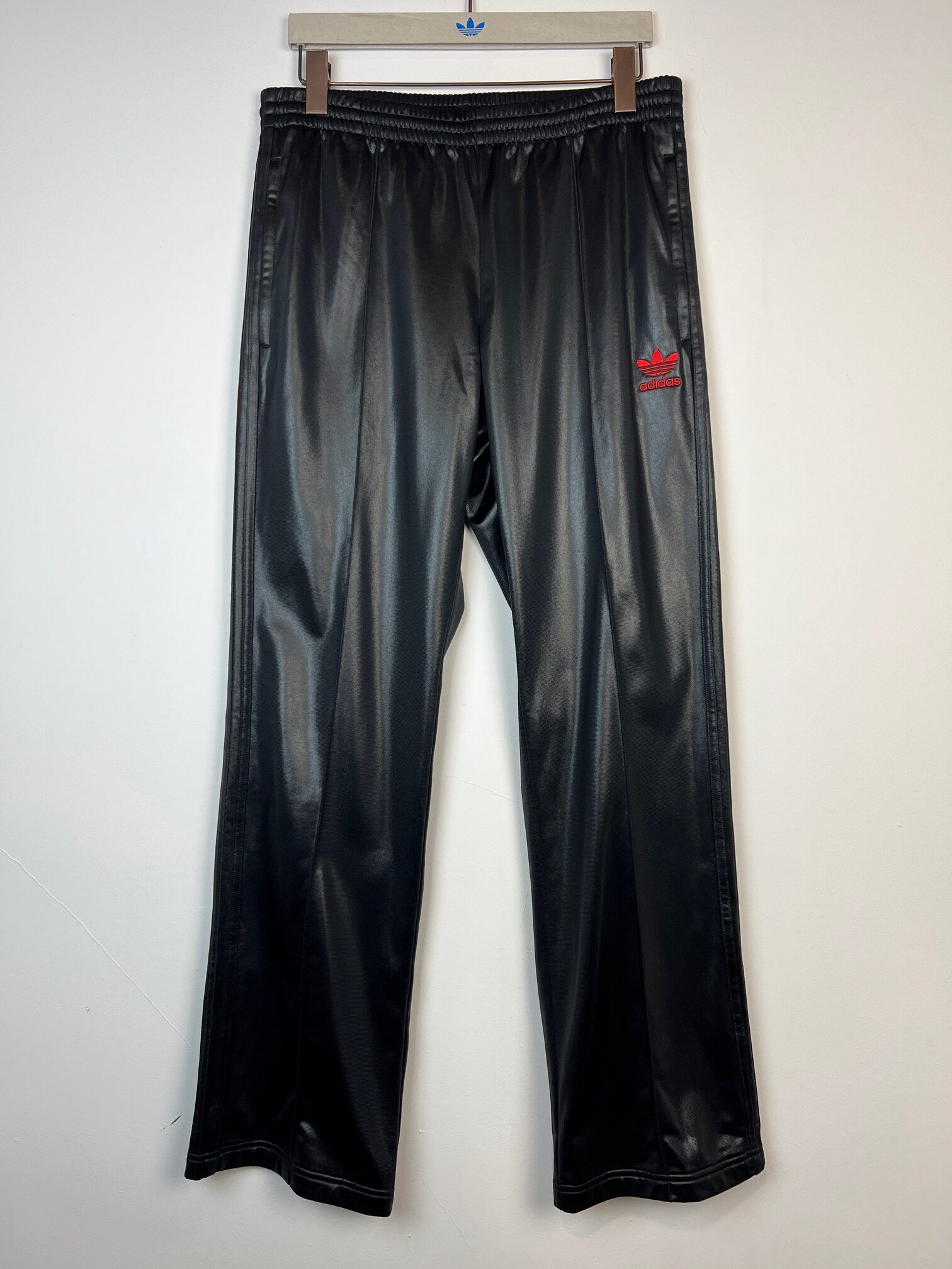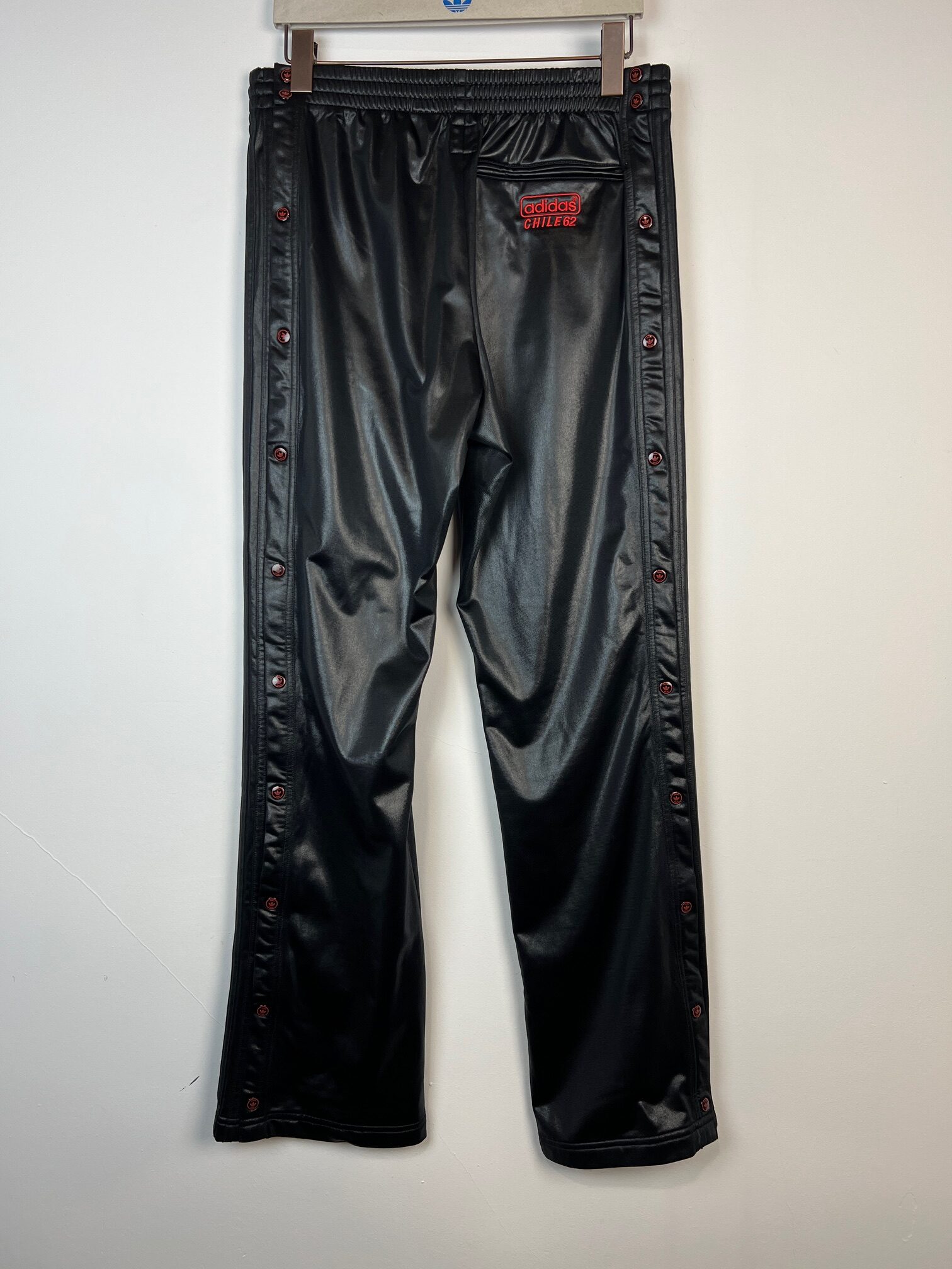 Spodnie męskie Adidas Chile62, czarne z rozpinanymi nogawkami po bokach, czerwone logo, prosta nogawka, 3 kieszenie na zamek, w pasie guma oraz sznurek, kant z przodu nogawki, metka z kodem produktu wycięta..