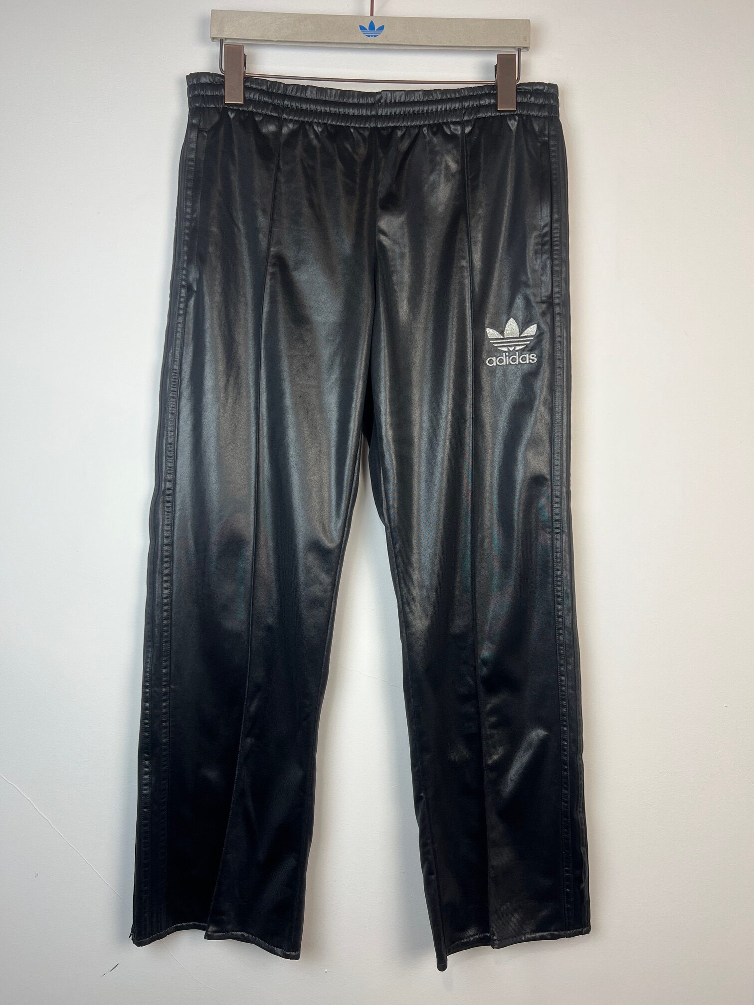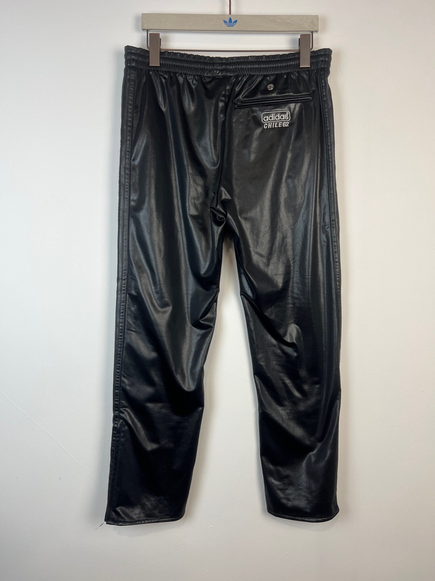 Spodnie męskie Adidas Chile62, czarne, materiał charakterystycznie błyszczący, srebrne logo oraz czarne paski, 3 kieszenie na zamek, prosta nogawka zakończona zamkiem 21 cm, w pasie guma oraz sznurek, kant z przodu nogawki.