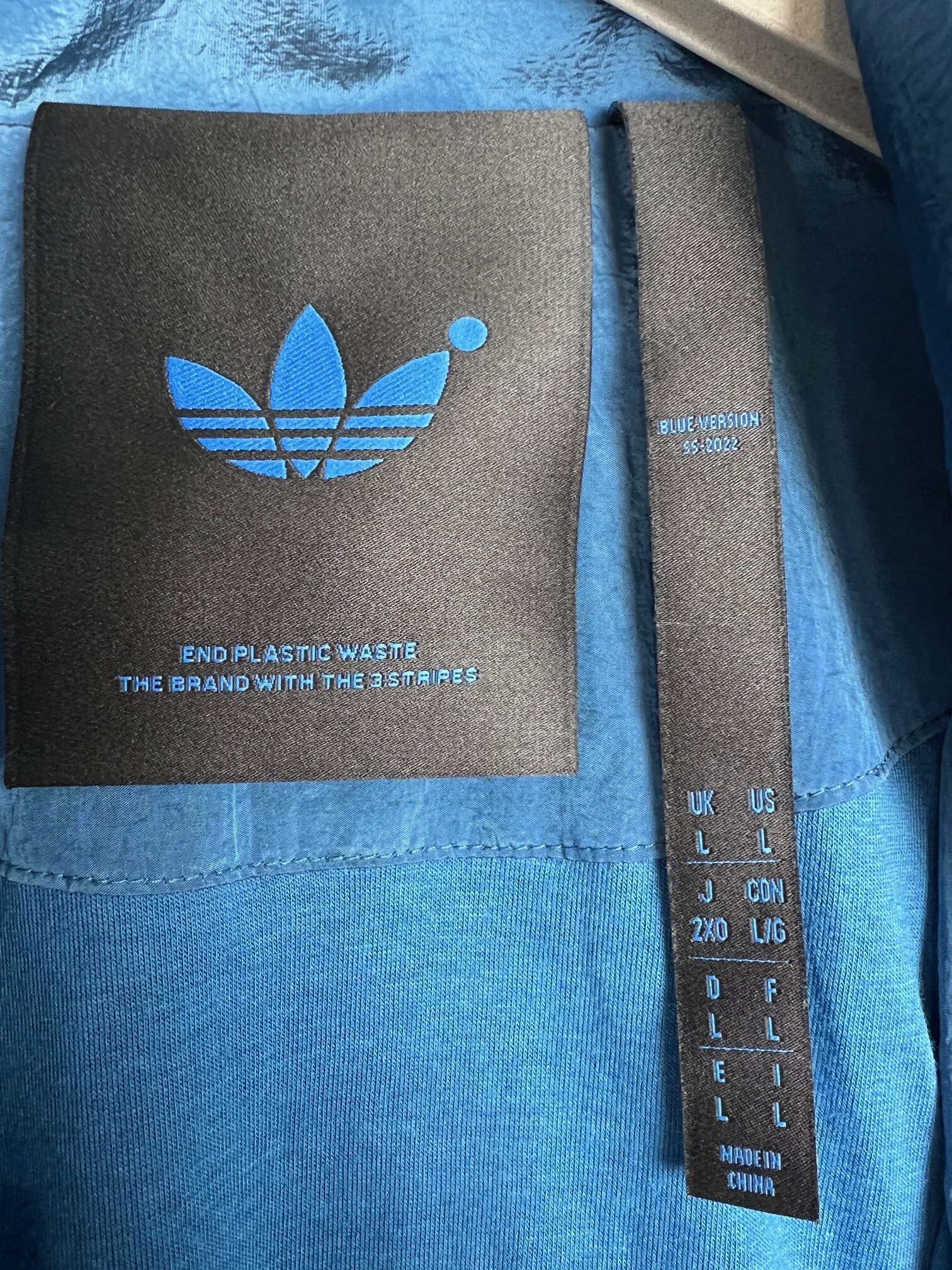 Kurtka ortalionowa Adidas, linia ekskluzywna Blue Version, w kolorze odcieni niebieskiego, zapinana na zamek dwukierunkowy, 2 kieszenie na zamek, połyskujący materiał.