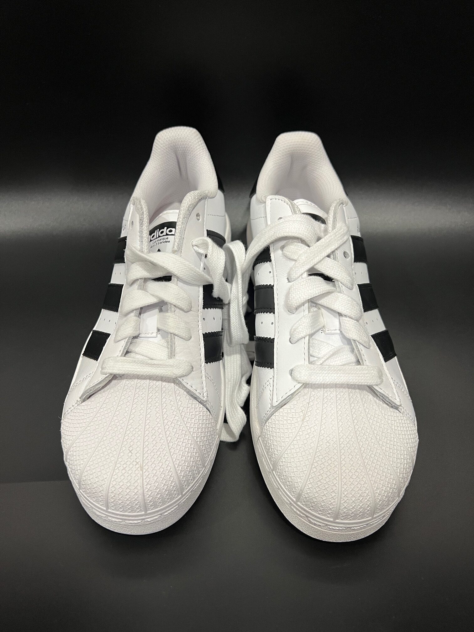 Sneakersy damskie Adidas Superstar,  białe z czarnymi paskami i czarnym logo na języku, z podwyższoną podeszwą, bez metek i oryginalnego pudełka.